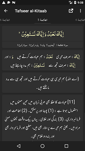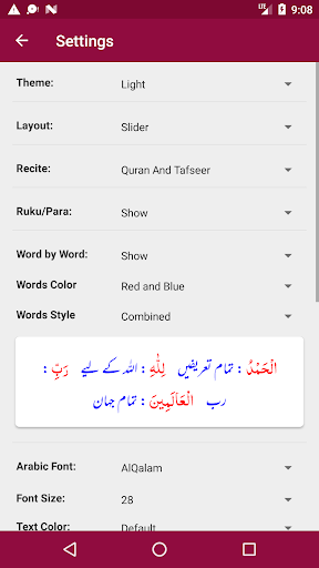 - Ability to show/hide Word by Word, Quran Translation (Tarjuma) and Tafseer