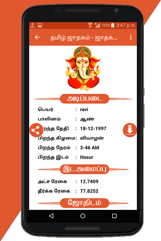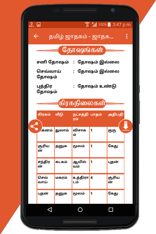 This app contains Basic Jathagam, Longitude and Latitude Details, Jothidam, Rasi, Nakshatra, Lagnam, Sun, Mars, Mercury, Jupiter, Venus, Saturn, Rahu, Ketu, Birth Kattam, Subar, Asubar and Marakkar Details, Panchangam, Jathaga Kattam, Navamsam, Lakna Kattam, Dosangal, Graha Positions, Dasha bhukti