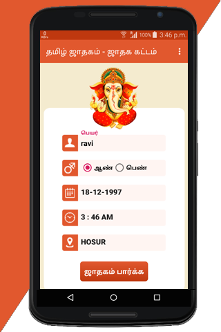 Just enter your details (Name, Gender, Date of Birth, Birth Time, Birth Place), See Your Jathagam (Tamil).