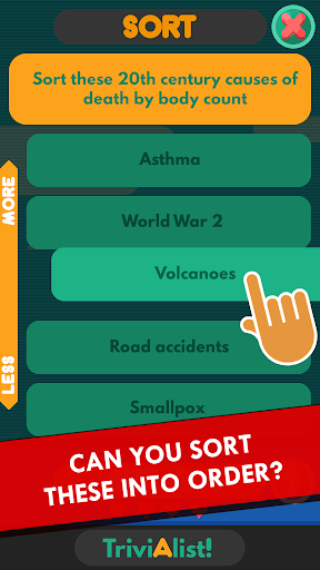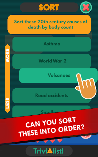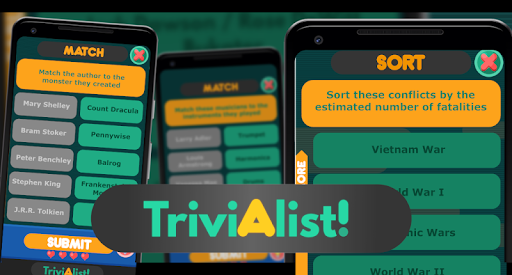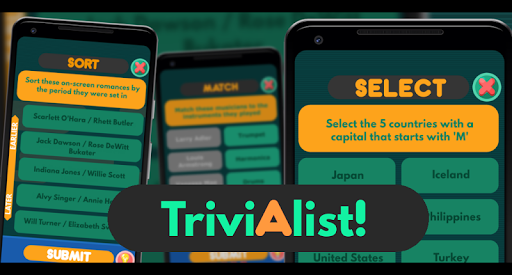TriviAlist! is a new offline trivia quiz game about the biggest, the best, and the most famous. It’s a game all about the ‘A - lists’ of life. Can you SORT 5 things in order? MATCH 5 pairs of things together? SELECT 5 things from a list of 10?