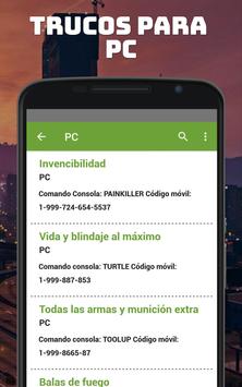 ¿Te encanta jugar al GTA V? ¿Te gustaría poder encontrar todo tipo de trucos para GTA V, en un solo lugar? La nueva app, Trucos de GTA V, tiene todo los trucos que necesitas para recuperar salud, conseguir dinero, generar vehículos especiales, conseguir los mejores coches, acceder a lugares secretos, activar distintos modos de cámara, y mucho más.