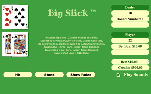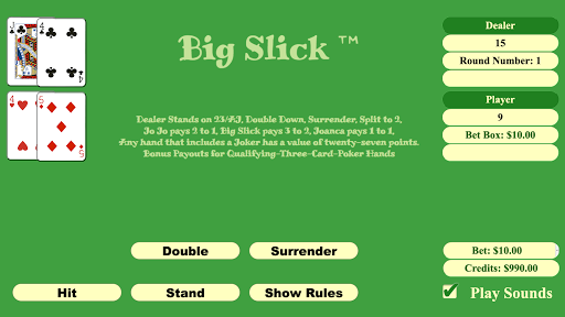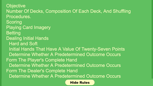 After the player selects a game, the app provides a graphic representation of a playing surface. On the playing surface, the app identifies a player's hand area and a dealer's hand area. The name of the family of games is written across the dealer's hand area. A summary of the set of game rules is written across the player's hand area.