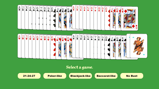 On the new page, the app displays a deck of cards spread face up across the surface of a table. Beneath the deck of cards, a set of five buttons appear. The five buttons enable the player to "select a game" from a group of games consisting of a 21-24-27 game, a poker-like game, a blackjack-like game, a baccarat-like game, and a no-bust game.