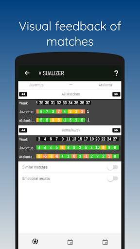 The betting app shows the real team form in colors in a visual way that tells you how hard or easy where the math for the team. This lets you split easy victories (fake winning streaks) from surprises victories or draws (underestimate teams) at one glance. None betting app lets you do this !!!