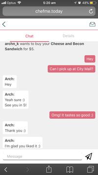 When you’re ready to place your order, you’ll see your makers pickup point or delivery address, an estimated pick up or delivery time through an instant message ( Yes, You can message and chat with Chefme Makers, and you can pay cash on pickup or delivery.