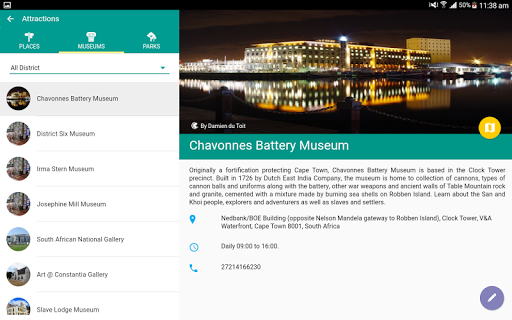 With detailed information of around 15 museums and 20 featured attractions along with 1000s of other Points of Interest carefully integrated with every single travel activity, Cape Town Travel - Pangea Guides is power packed with utilities and information. From Facebook Check-Ins to local event information, offline map to intuitive Augmented Reality experience, we have brought most of the travel activities and application needs to one single app. Save precious travel time rather than switching between several apps and utilities!
