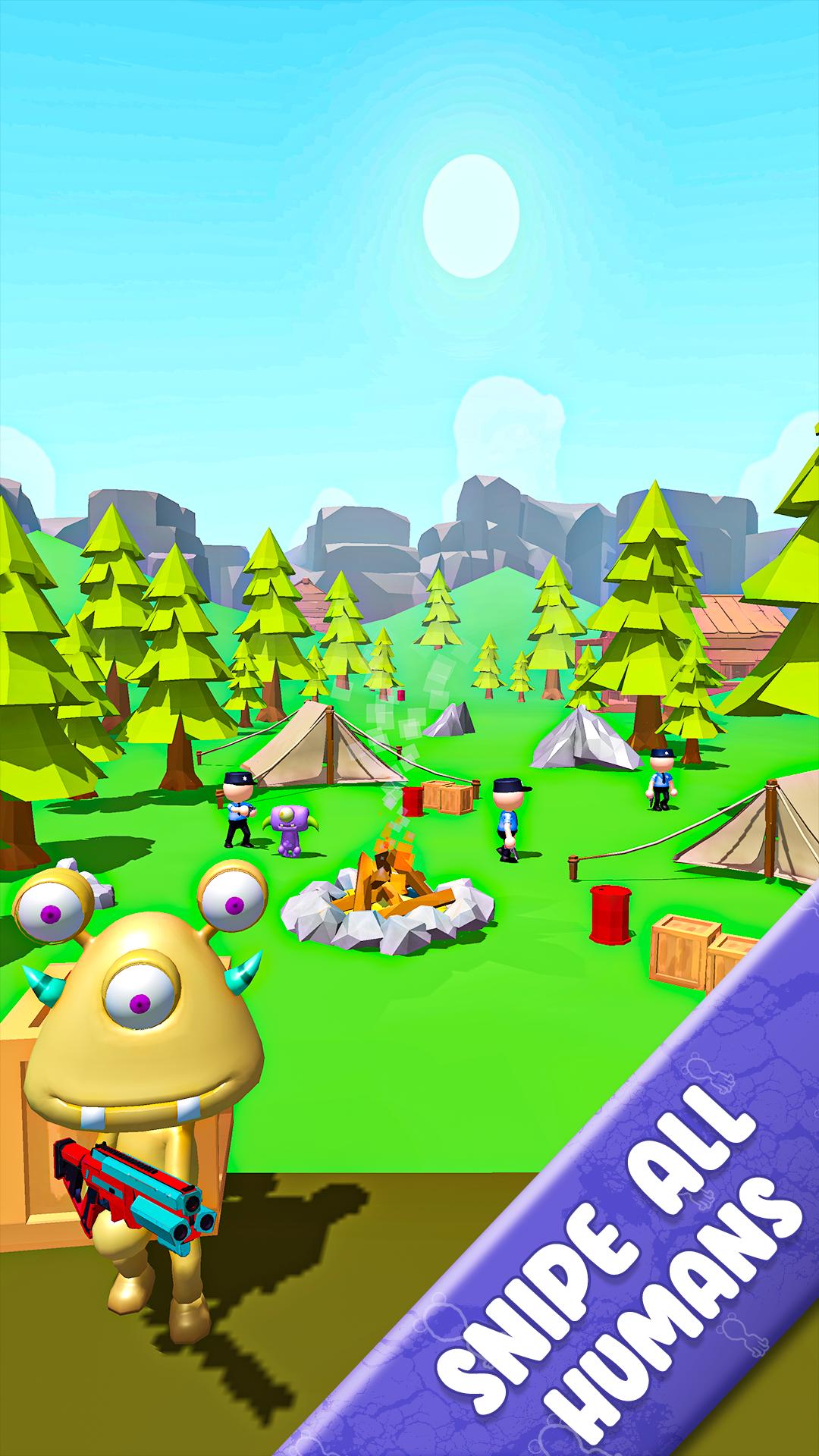 Fun interactive levels. Plenty of meat heads to snipe and test your aim. Choose from a variety of guns and fight those humans. It's an alien invasion we are talking about.