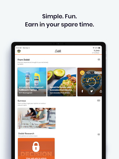 Earn on Dabbl whenever and wherever you choose. Do a survey while sitting at home watching TV. Watch a short video while standing in line. Do a few offer wall tasks while on lunch break...any spare moment in the day can now have value with Dabbl!