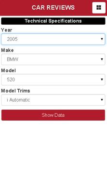 Search for reach technical specifications of all makes and models based on model years in car reviews app.