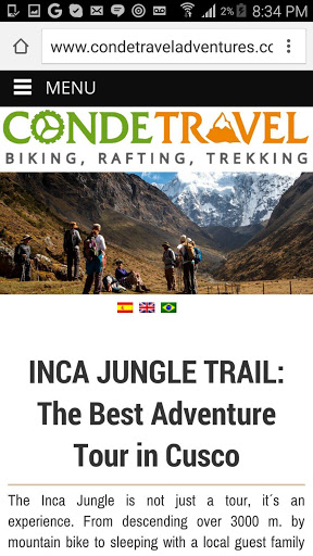Conde Travel S.A.C. is a Peruvian company based in Cusco and Lima, that has been operating on the market since 2002. We are a 100% local Peru travel tour operator, specialized in adventure sports such as trekking, biking, rafting and zip line, which we organize both in the Cusco region as well as in other regions of Peru. In our offer you will find, among others, such well-known tours like Salkantay trek, Inca Jungle, Inca Trail, Ausangate trek and many other tours such as mountain biking and quad tours which take place in the beautiful and scenic areas of our country.
