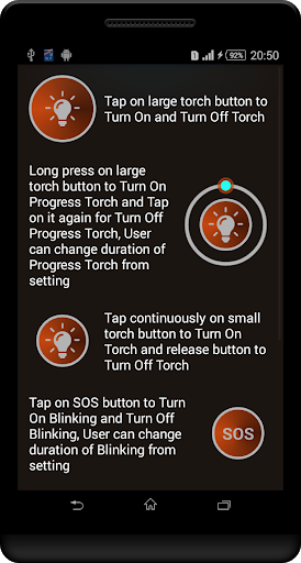 My Amazing Torch app take permission from camera for LED Flash Light and become Torch for user and provide bright flash light. It has many different features like SOS, Progress Torch etc.. with customize duration, So user can manually use all functions, turn torch ON - OFF and select duration for different purpose. Even user can add widget shortcut on home screen for direct usage of torch.