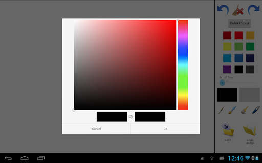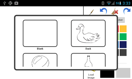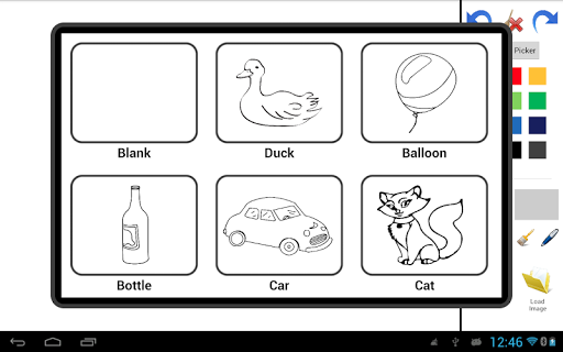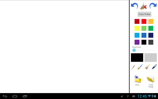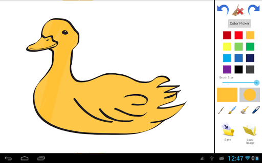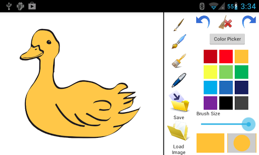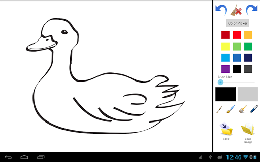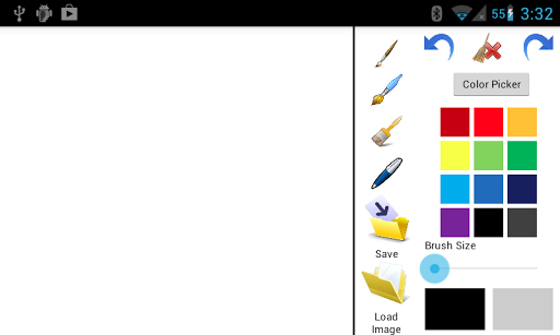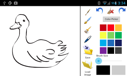 That Application for drawing with multiple colour from Color Picker. Load images which provide there and blank image. Save the drawing sdcard. Select Brush style and size Redo, Undo and Clear also available.