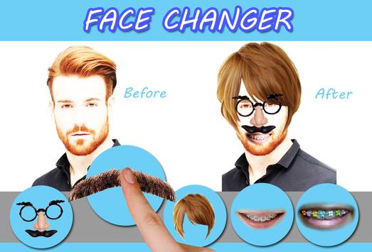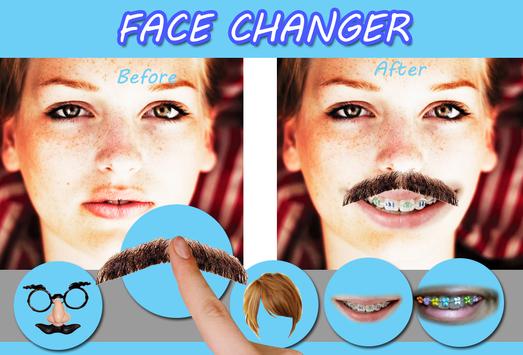 unny Face changer is amazing application that will allows you to create extremely funny photos. Select Photo form gallery or Capture from camera. take photo to funny Photo Editing Lab and Apply cool effects and stickers including, "Mustaches", "Beard","Hairs", "Glasses" etc, Change face with funny face changer according to your likings and share photo with friends.