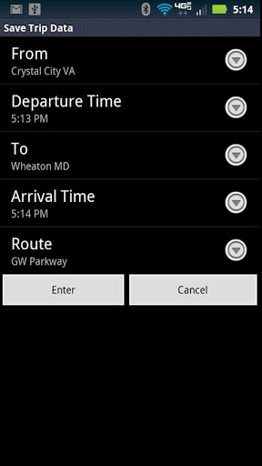 2. Press Stop when you reach your destination to bring up the data recording screen. Edit the values as necessary (new origins, destinations and routes can be added to the defaults by selecting "new") and press enter.
