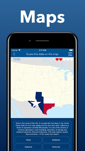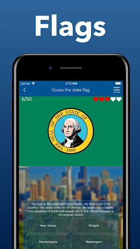 A great application for everyone who studies the geography of America, in particular, maps and flags and the capitals of the United States. Take the US geography test to the end! Find out and guess all 50 US states! Test your knowledge of American history! Discover new states and capitals for you!