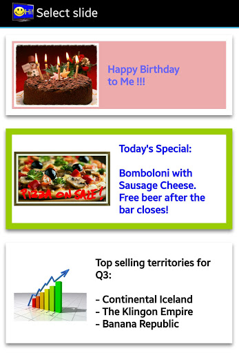 The billboard slides can be viewed and created off-line on the Android device. The slides can be left displayed on the screen if the phone/tablet is disconnected.