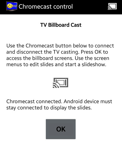 A Chromecast connection is needed to cast the billboards on a TV set or HDMI monitor. Smart TV's and streaming boxes require the free companion TV app Smart TV Billboard available on Google Play for TV's (search for "tvdwsi") and on Samsung Smart Hub TV Apps (search for "Smart TV Billboard").