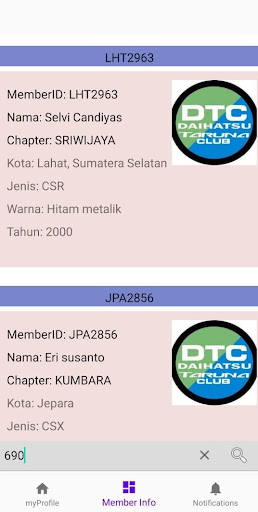 - pencarian member berdasarkan kata yang terkandung pada nomer punggung, nama, kota, nomor polisi atau nomer handphone.