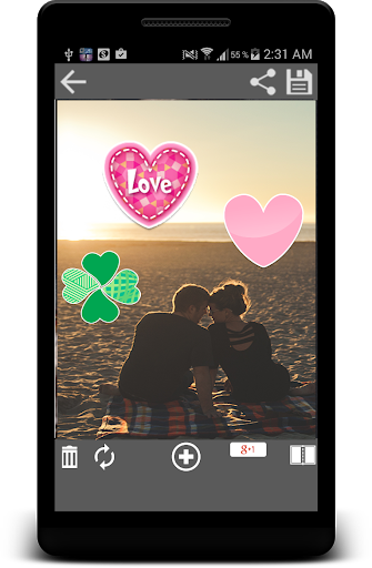 Select a Pic from Gallery or shoot a Photo. Press the button in center-bottom to add your favourit Heart or Love Sticker to your Picture. Drag it to the right position and resize it with multitouch. Save and share your edited photos using the button in the top-right corner.