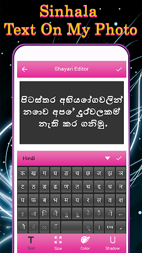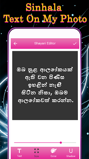 application which has all latest tools to make your image more amazing with Sinhala text. with "Sinhala Text On My Photo" is an amazing application to express your feelings in the form of words. Add amazing quotes on your photo and make your photo more expressive. This is complete text editor which has a lot of edit options such as text size, text color, shadow and also with text radius.