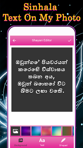 application which apply Sinhala text on image with simple few steps. with this application, you can also write anything with Sinhala keyboard. you can write all Sinhala Alphabet, letter any words. with this application you can change the background you can also set your own image BG. this application is useful for those people who want to learn Sinhala without going anywhere.