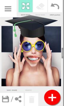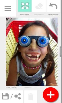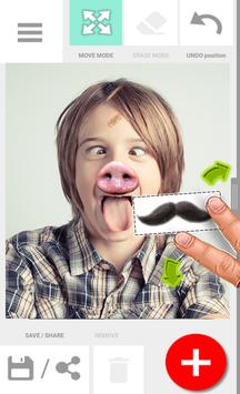 The app works like face blender or mixer that let you modify pic. Create the deformation - funny faces, you like. Choose your photo from album, or camera, and then just press add button, and choose the sticker. You can add many attachments at the time. Move it, resize it, erase some parts of it, undo and redo changes.