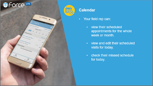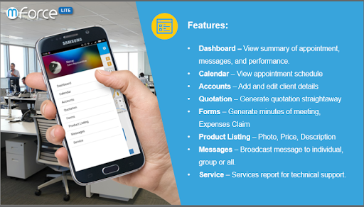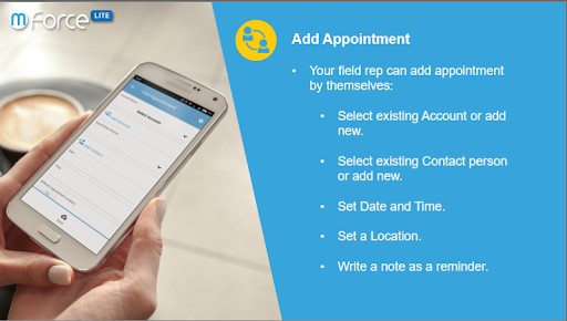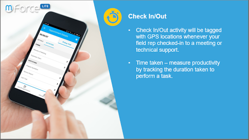 mForce-LITE empowers your field representative to manage their business appointments, to easily retrieve encoded customer information and appointment history, to perform and monitor their activities and progress, and to complete their reporting such as creating minutes of meetings and filing expenses claims through their mobiles with just a few clicks of the buttons.