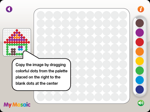 My Mosaic helps develop visual perception skills and hand eye coordination. The game also requires and helps develop perseverance, diligence and accuracy. It is designed for children aged 4 years old.