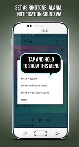 - Select the song you want to use as a ringtone by touch and hold it briefly until menu appears, like as "set as ringtone" , "set as default alarm sound", "set as notification sound"