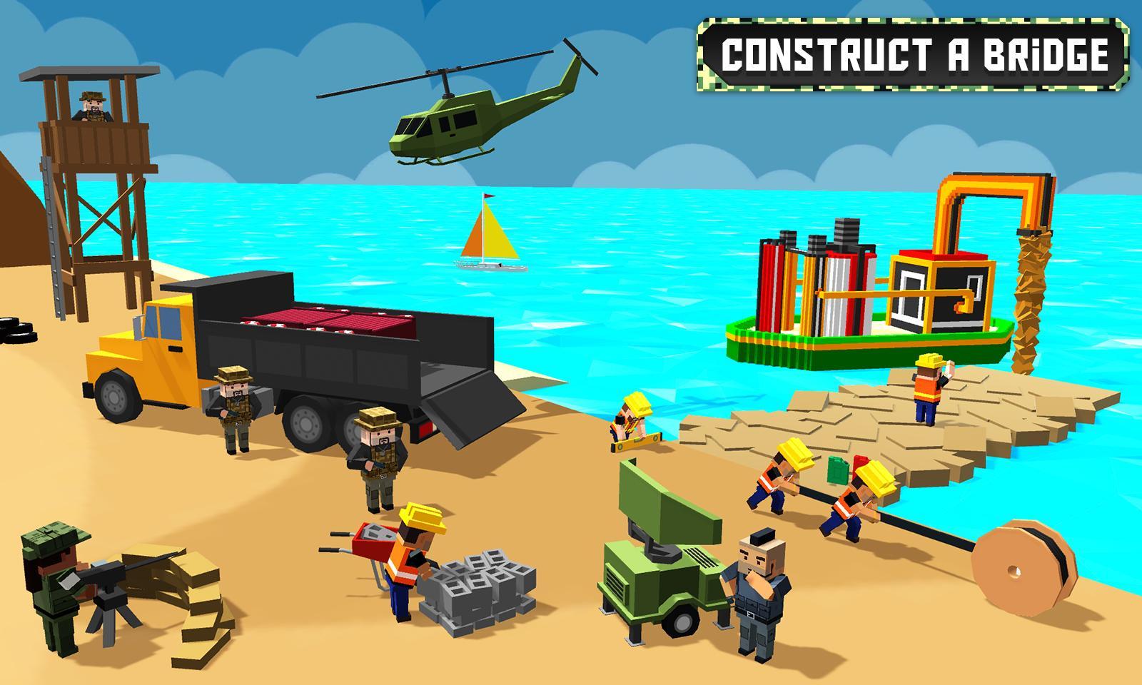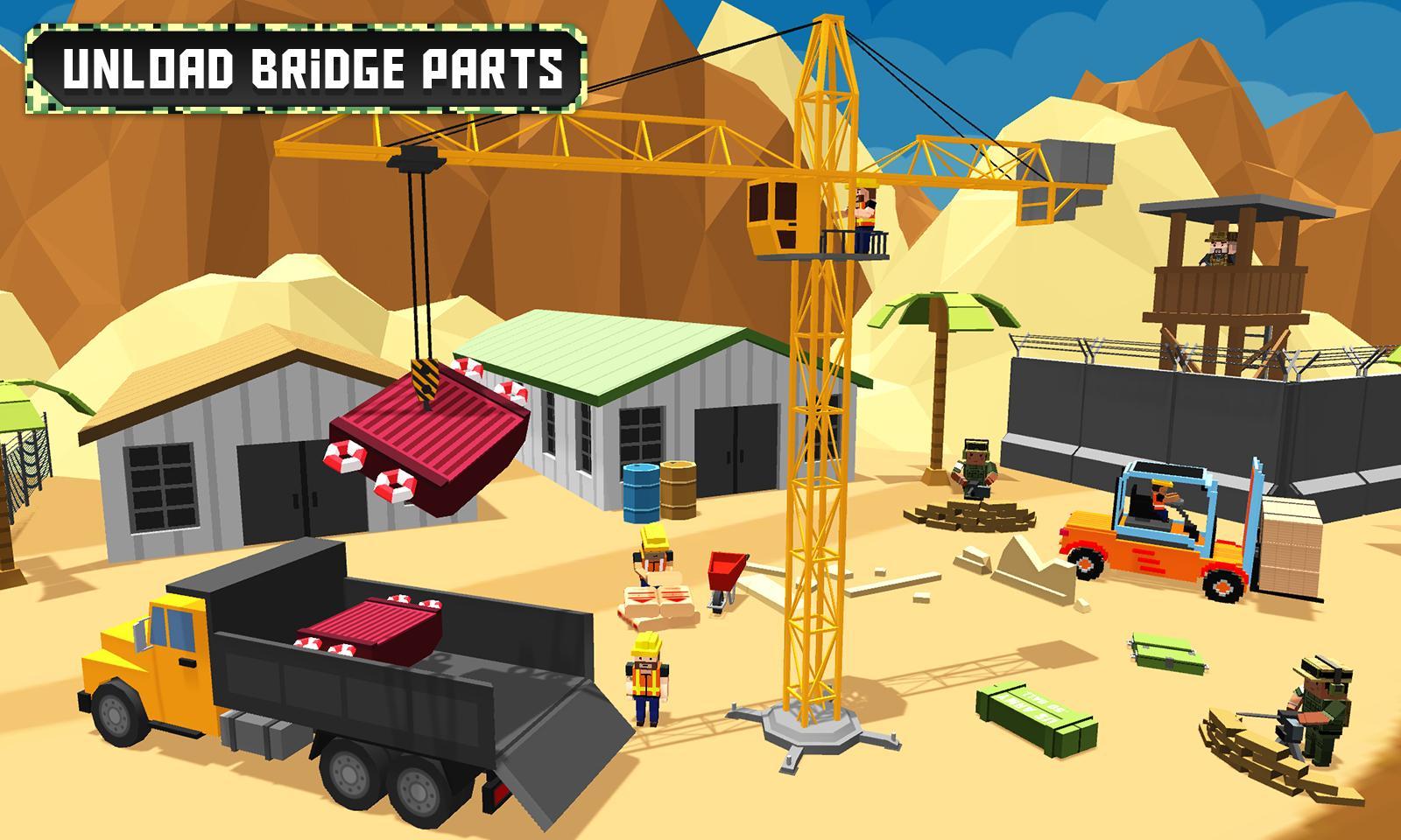 The story of US Army Bridge Building Simulator is that army wants to land on a new piece of the land in this desert trucks. This piece of the land is across the river. This river does not have any way for crossing. In this american construction trucks the captain gave you the task to make the temporary connection to cross the river. All processes are divided into 12 levels in this modern army construction games. In the first level of real bridge construction there will be dialogue between you and the captain. He will allow you to start to make link with the help of given material in heavy army machinery. The material is already placed in the loader of extreme bridge building. Being the russian army bridge construction you have to place parts by using mobile crane. When you are done with the material there you face the shooting of enemies in army construction training you came to know on the spot that there are few enemies who want to stop you to make this bridge in pk army ravi bridge construction. You shoot them for your defense. Then in the next level of military construction transport you need to tighten the screw. The next mission of military trucks is to drive the army van to the other side of the river. As you passes through the way in construction engineer you need to destroy it as the enemies again can attack on you. Now you can do tank practice in this real bridge building. Suddenly few enemies attack on you start battle with them in this bridge construction method. You can fight for defense with the help of guns. Again you have to make the bridge by following the previous process in this river side construction game. Then you can do tank practice again for your defense in us building game. After that you have to fight with army bridge building in india.