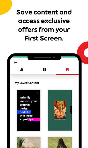 At any time on the First Screen, you can: save content using the save button, share content quickly, and access your First Screen profile to access coupons and saved content.