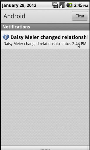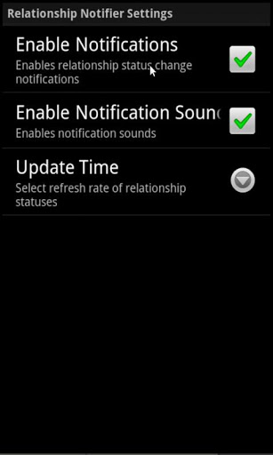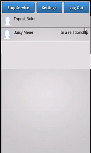 When one of your facebook friends changes his her relationship status, Facebook Relationship Notifier notifies you with notification messages. Updater service starts when you open the application and it continues to run even if you close the application. You can set the update interval by clicking settings button at the top of the menu. If you want to stop the service, you can click stop service button.note that this release is the beta version of Facebook Relationship Notifier and if you find any bugs in the application, please email the publisher so we can fix them.