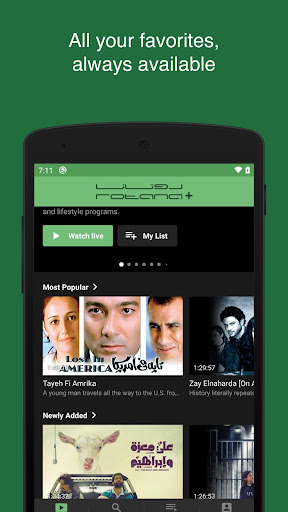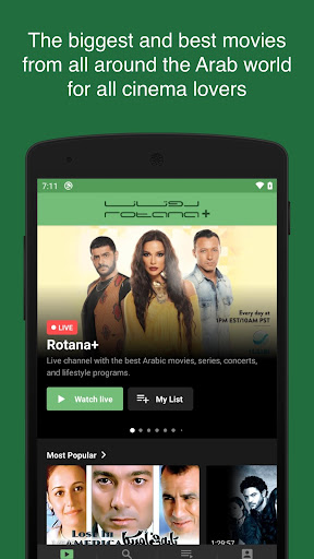 Rotana features live streaming channels and on-demand movies, concerts, and plays:
