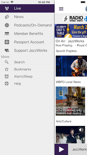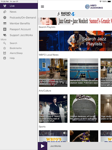 The JazzWorks Public Radio App allows you to listen to JazzWorks, pause and rewind the live audio, and view the program schedule all at once! You can explore On Demand content, search for programs, bookmark a program for later, and wake up to JazzWorks with the alarm clock!