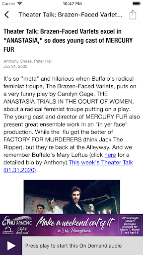 • The JazzWorks Public Radio App displays the web page associated with the program or program segment you are listening to On Demand so you can explore for more information.