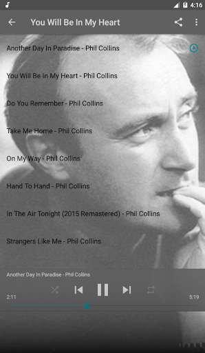 Phil Collins Free Album Offline is a fun application to help you listen to offline music without the Internet. In addition, Phil Collins Free Album Offline is also a collection of Phil Collins music albums. The high quality MP3 songs performed by Phil Collins are selected by us and put into Phil Collins Free Album Offline application. This is the best and most complete Offline music app for Phil Collins's lifetime albums we've compiled.