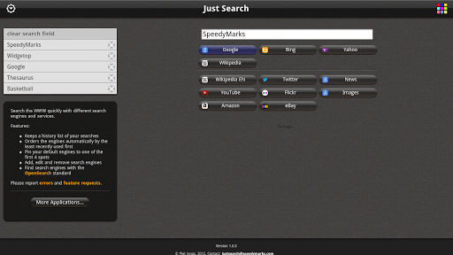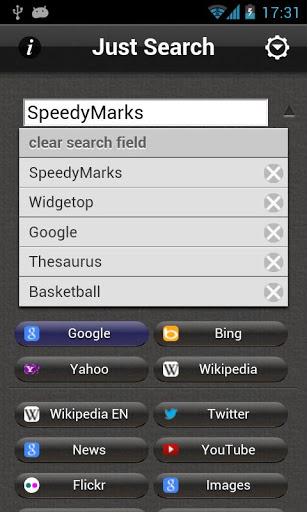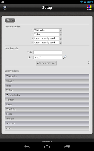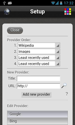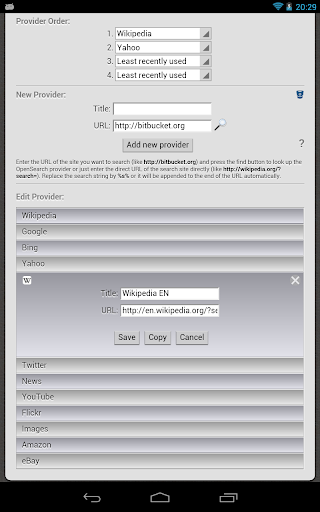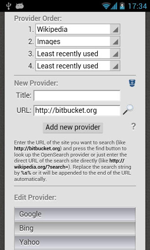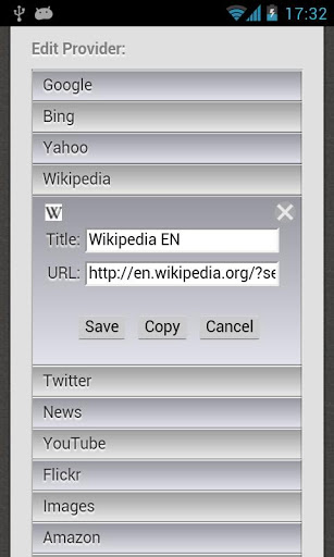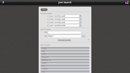 - predefined with Google, Bing, Wikipedia, Yahoo, Twitter, Flickr, Youtube and more