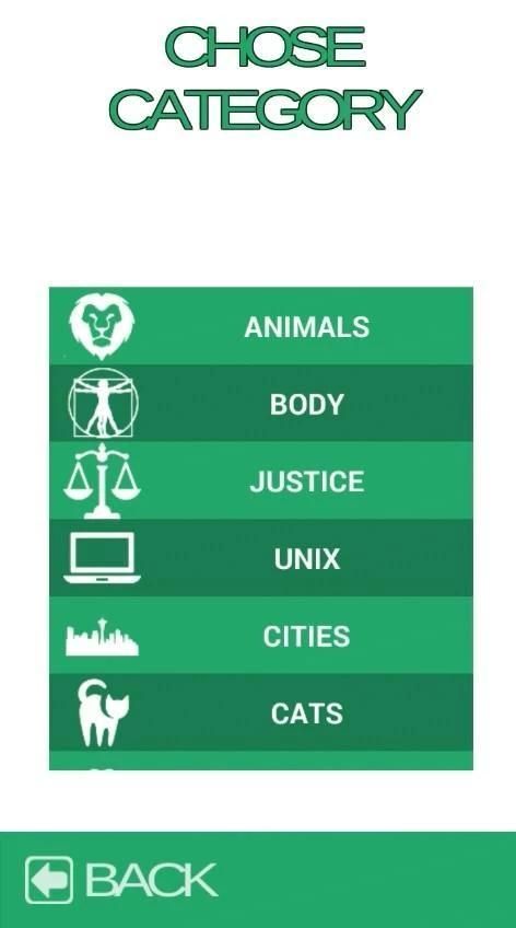 - Puzzle is divided into several categories: animals, body, justice, celebrities, city, films, cartoons, clothing, country, flowers, food, profession, music, fruit, names and transport.
