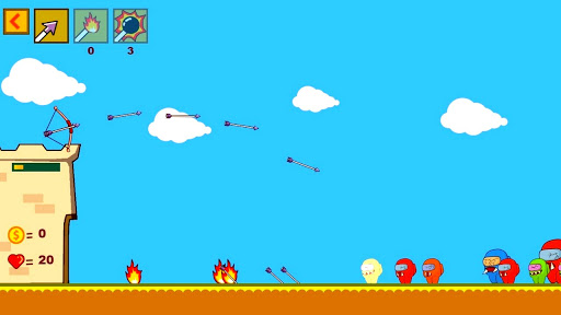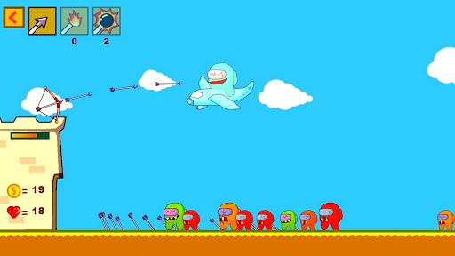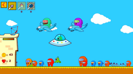 Archer vs Zombie Among As — an amazing game in the style of "Tower Defense", in which you will defend the castle from the invasion of impostors zombies Among As. To start playing, click on the arrow in the center. Hordes of alien zombies have arrived on Earth. Master your archery skills to kill all the Among As and their UFOs. The zombies Among As need to be hit several times to kill. The level is given 3 pieces of additional weapons: bombs and burning arrows. They are displayed in the upper-left corner. Tap on the icon to use it. Also, between the rounds of the game, you can buy bombs, the speed of shots for the money earned in the battles. This will make it easier to fight the zombies.