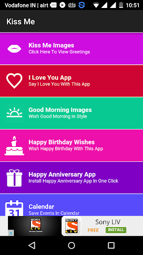 This application makes it very simple for you to send a beautiful Kiss Me messages to your partner, and loved one through your phone.