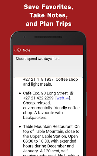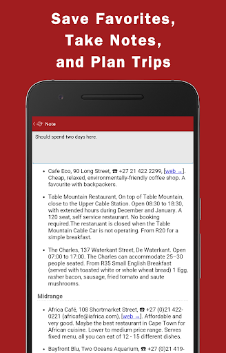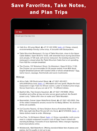 Add your own notes to each travel destination and keep a list of your favorite places for easy access during your trip.