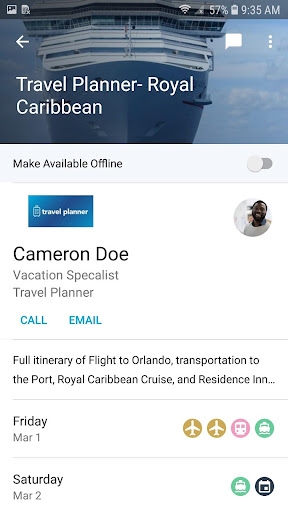 After planning your dream getaway with your vacation specialist, they will send you an itinerary for each trip they book you on complete with all relevant details and their contact information. You will have a record for all travel plans including: shore excursions, tour details, dining reservations, accommodations, departures, arrivals and anything else you and your vacation specialist have planned for your amazing getaway. Your vacation specialist will provide the information on hotels, flights, cruises, restaurants, landmarks and more! Itineraries get synced into this app so you can make sure you are on time to have a great time every time.