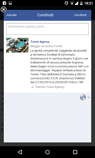 Le offerte che visualizzerai con la nostra App possono essere condivise anche sul tuo profilo facebook in modo da poterle sottoporre ai tuoi amici o nei tuoi gruppi.