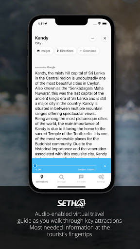 Seth offers you a new and interesting way of travelling in Sri Lanka. The virtual travel guide that'll help you travel in Sri Lanka by yourself or even with company. The app will assist you with audio-guided tours to places in your vicinity by location.