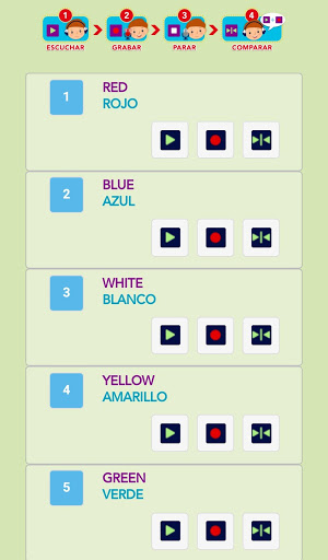 Esta aplicación permitirá al niño o niña identificar palabras con su imagen correspondiente, leerlas, escucharlas e incluso practicar su pronunciación grabándose a sí mismo y comparando su grabación con la pronunciación real de la palabra en inglés, con voces de otros niños y adultos.