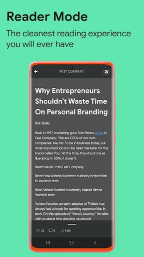 Explore: Personalisation engine, reading mode, verifiable badges, text-to-speech, personal library, easy sharing on any medium, daily newsletter, bookmarks, refined and personalised recommendations from top publications and magazines, current news of the day