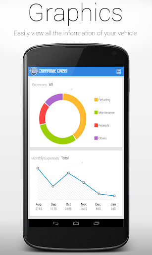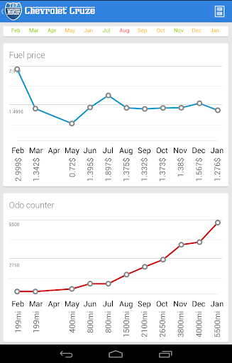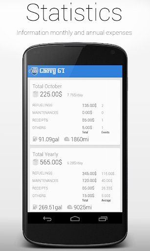 • Monthly and annual statistics on Holo style cards (fill ups, fuel economy, mileage, vehicle expenses, maintenances, receipts,...)