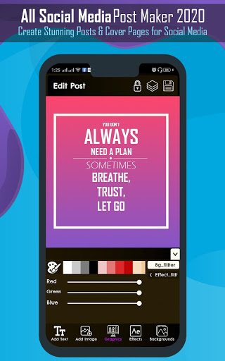 Are you looking for some Social Media Post maker with all sizes of 2020 and also offline, now you can create amazing posts for social networking platforms with just few clicks and all is free. Select your favorite background within the app or from your gallery, text style, colors and fonts from a big range of variety you want to add, give your social media post some background effects animated or simple, make your social media post more stunning with adding text shadows and background colors, you can choose the opacity of text and also can add multi-layer of your social media post text.