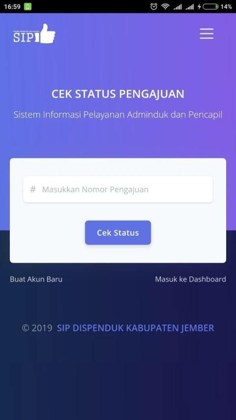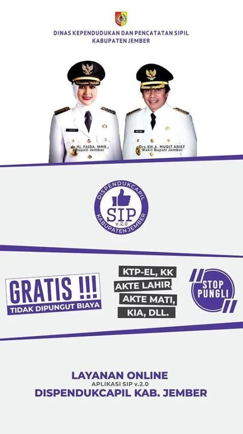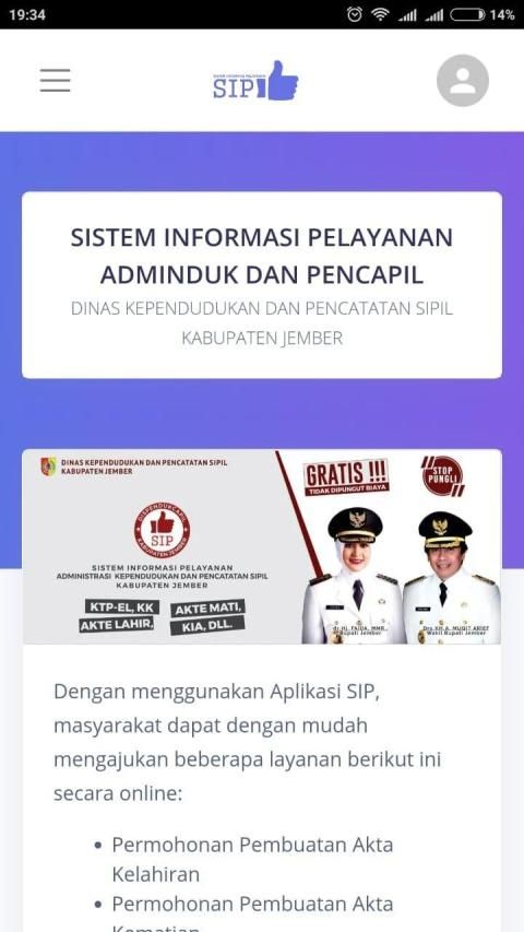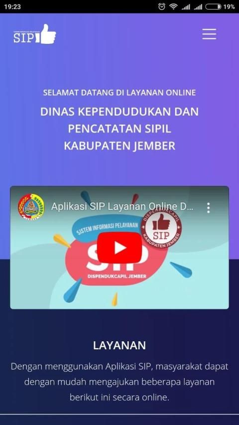 Permohonan Layanan Secara Online melalui Aplikasi Sistem Informasi Pelayanan Dispendukcapil Jember. Dengan menggunakan Aplikasi SIP, masyarakat dapat dengan mudah mengajukan beberapa layanan berikut ini secara online: