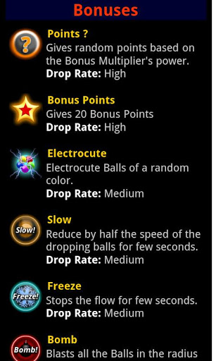 Perform sequences of the same color without letting any ball go over the bottom. Drop Bonuses and acquire Bonus Points to spend on upgrades.